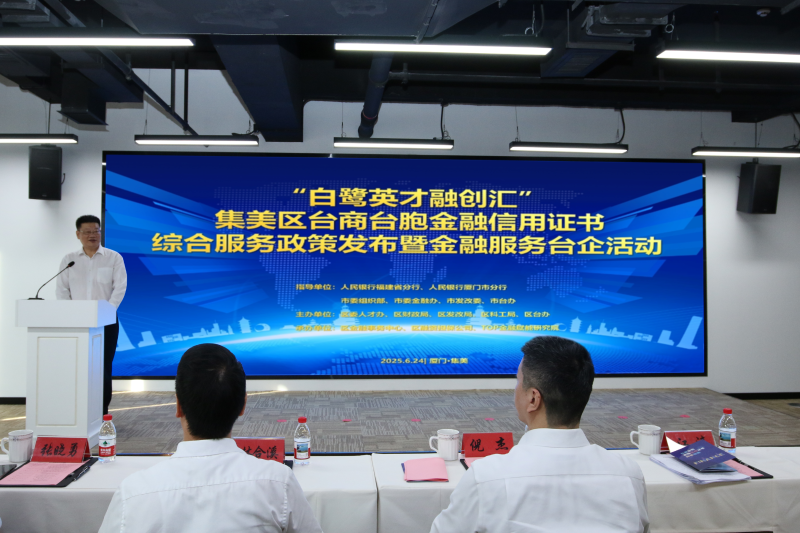 2025年6月24日,“白鹭英才融创汇”台商台胞金融信用证书综合服务政策发布暨金融服务台企活动在厦门举行。本次活动由中国人民银行福建省分行、厦门市市委组织部、市委金融办、市发改委、市台办指导,中国人民银行厦门市分行、集美区政府联合主办,集美区委人才办、集美区金融事务中心承办。活动旨在以“台商台胞金融信用证书”为核心,打造“1+N”(1本证书+N个应用场景)综合政策服务体系,构建“信用赋能—政策扶持—人才评定—公共服务—资金融通”全场景服务模式,为两岸融合发展注入新动能。中国人民银行厦门市分行党委书记、行长江涛,厦门市集美区委副书记、区长倪杰出席并致辞,市区两级政府部门、金融机构及台商代表共同见证政策落地。